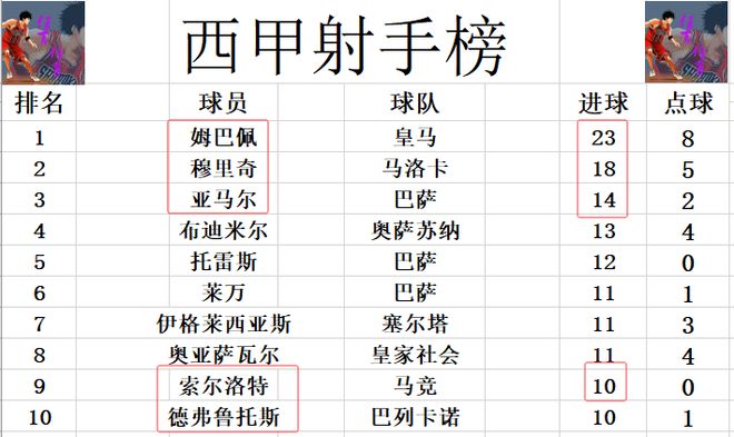 射手榜方面,姆巴佩23球领跑,穆里奇趁着姆巴佩伤缺紧追上来,今天梅开二度后将差距缩小到5球。亚马尔打入制胜球,14球位列第3,布迪米尔13球排在第4。索尔洛特破门,追上德弗鲁托斯,将前十门槛提高到10球。